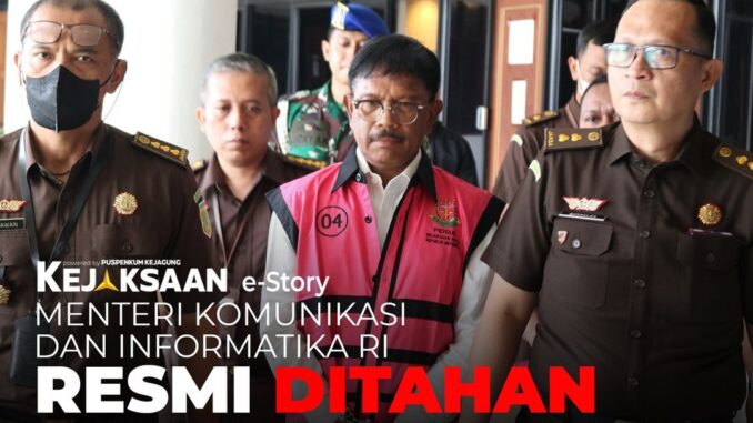 Rabu 17 Mei 2023, Tim Penyidik pada Direktorat Penyidikan Jaksa Agung Muda Bidang Tindak Pidana Khusus (JAM PIDSUS) telah melakukan penahanan terhadap JGP selaku Menteri Komunikasi dan Informatika RI yang di tetapkan sebagai Tersangka dalam perkara dugaan tindak pidana korupsi dalam penyediaan infrastruktur Base Transceiver Station (BTS) 4G dan infrastruktur pendukung paket 1, 2, 3, 4, dan 5 BAKTI Kementerian Komunikasi dan Informatika Tahun 2020 s/d 2022.