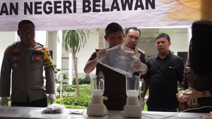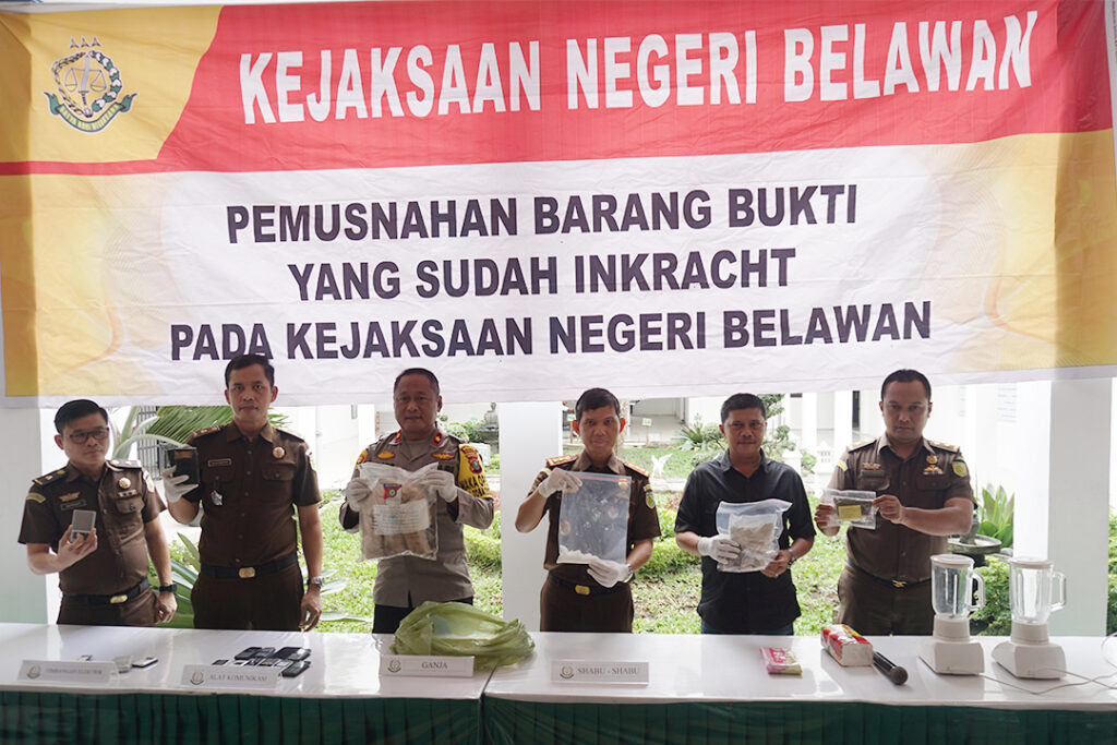 Kepala Kejaksaan Negeri (Kajari) Nusirwan Sahrul, SH, MH dan Wakapolres di Belawan memusnahkan ratusan gram narkoba jenis sabu-sabu dan ganja serta timbangan barang bukti atas perkara yang telah incrah (berkekuatan hukum tetap), Selasa (31/10/ 2023) sekira pukul 10.05 Wib.