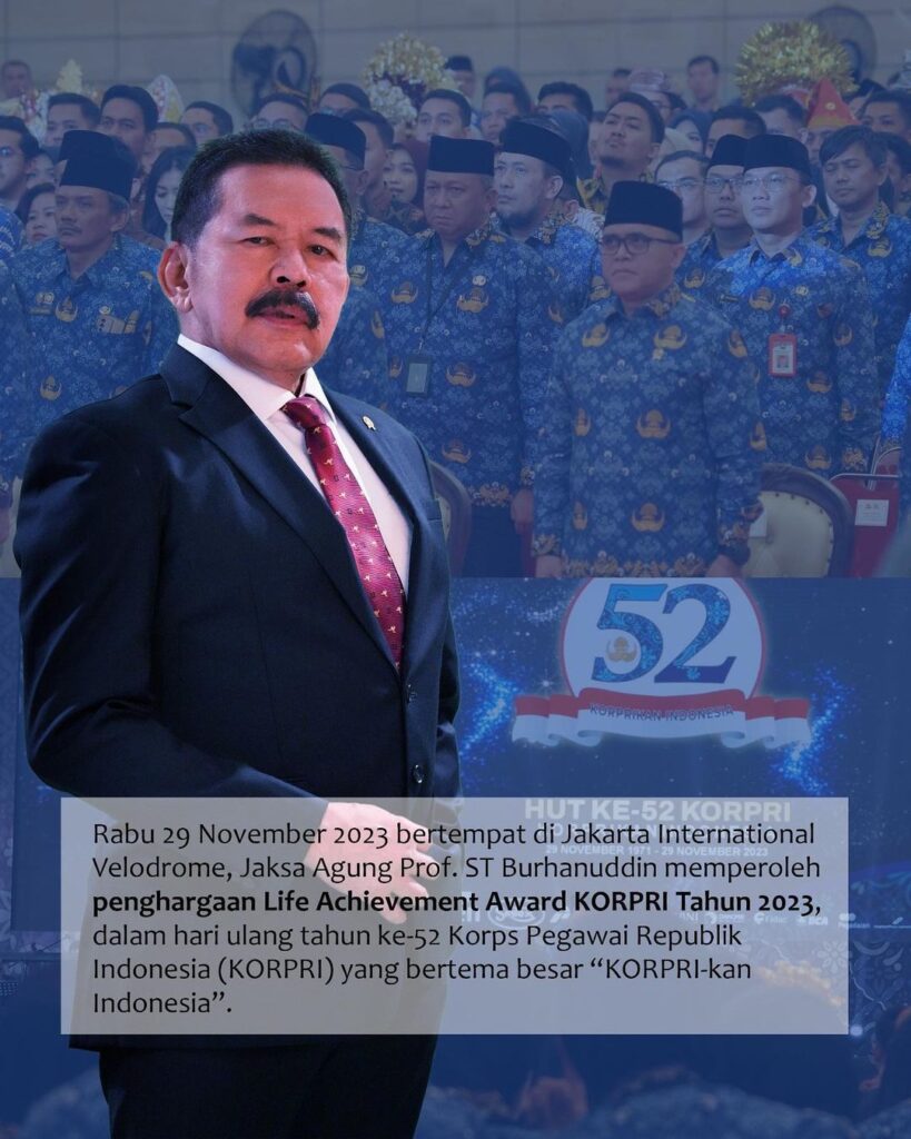 Rabu 29 November 2023 bertempat di Jakarta International Velodrome, Jaksa Agung Prof. ST Burhanuddin memperoleh penghargaan Life Achievement Award KORPRI Tahun 2023, dalam hari ulang tahun ke-52 Korps Pegawai Republik Indonesia (KORPRI) yang bertema besar “KORPRI-kan Indonesia”.