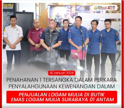 Kamis 18 Januari 2024 bertempat di Gedung Bundar Kejaksaan Agung, Tim Penyidik pada Direktorat Penyidikan Jaksa Agung Muda Bidang Tindak Pidana Khusus (JAM PIDSUS) telah menetapkan dan dan melakukan penahanan terhadap Tersangka BS selaku pengusaha properti mewah yang berdomisili di Kota Surabaya, terkait dengan perkara dugaan tindak pidana korupsi penyalahgunaan kewenangan dalam penjualan Logam Mulia di Butik Emas Logam Mulia Surabaya 01 Antam.