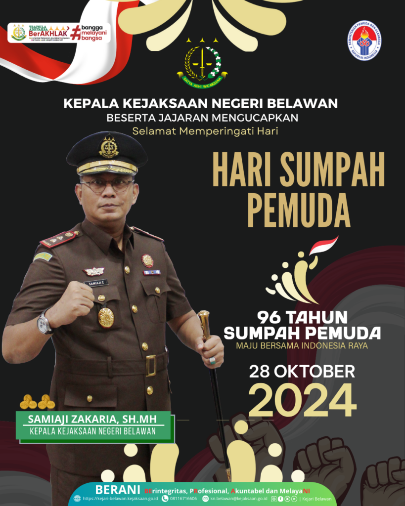 Bertempat di Halaman Kantor Kejaksaan Negeri Belawan telah dilaksanakan Kegiatan Upacara Peringatan Hari Sumpah Pemuda Kejaksaan Negeri Belawan yang diikuti seluruh Pegawai dan PPNPN Kejaksaan Negeri Belawan