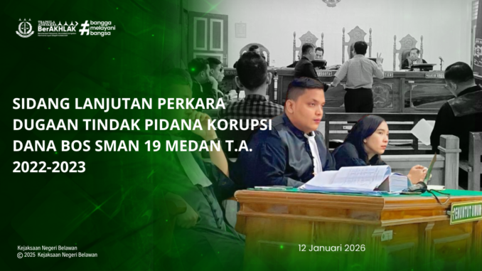 Senin [12/01/2026], Kejaksaan Negeri Belawan melalui tim Jaksa Penuntut Umum (JPU) pada Seksi Tindak Pidana Khusus menghadiri sidang lanjutan Perkara Dugaan Tindak Pidana Korupsi Dana Bos SMAN 19 Medan T.A. 2022-2023 an. terdakwa RN, EY, SM, dan TJT dengan agenda mendengarkan keterangan ahli yang digelar di Pengadilan Negeri Medan Kelas 1A Khusus.