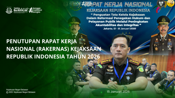 Kamis [15/01/2026], Kepala Kejaksaan Negeri Belawan Dr. Yusup Darmaputra, S.H., M.H., beserta Kasubbag Pembinaan, para Kepala Seksi dan Staf pada Kejaksaan Negeri Belawan mengikuti Penutupan Rapat Kerja Nasional Kejaksaan Republik Indonesia dengan tema “Penguatan Tata Kelola Kejaksaan dalam Reformasi Penegakan Hukum dan Pelayanan Publik Melalui Peningkatan Akuntabilitas dan Integritas”. yang diikuti secara virtual dari ruang rapat Kejaksaan Negeri Belawan.