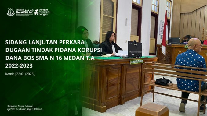 Kamis [22/01/2026], Tim Jaksa Penuntut Umum pada Seksi Tindak Pidana Khusus Kejaksaan Negeri Belawan menghadiri sidang lanjutan perkara Dugaan Tindak Pidana Korupsi Dana Bos SMAN 16 Medan T.A. 2022-2023 an. terdakwa RA selaku Kepala Sekolah, EAD selaku Bendahara dengan agenda pemeriksaan saksi lanjutan yang digelar di Pengadilan Negeri Medan Kelas 1A Khusus.