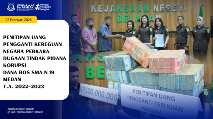 Senin [02/02/2026], Kejaksaan Negeri Belawan melalui Seksi Tindak Pidana Khusus menerima penitipan uang pengganti kerugian keuangan negara dalam perkara dugaan tindak pidana korupsi Dana Bos SMA Negeri 19 Medan T.A. 2022-2023 dari terdakwa RN (selaku kepala sekolah) sebesar Rp. 500.000.000,- (lima ratus juta rupiah).