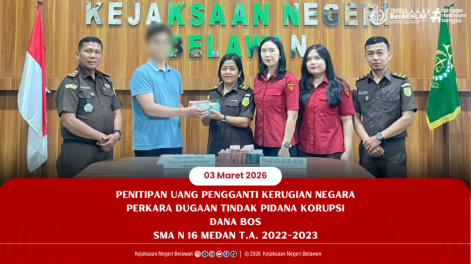 Rabu [04/03/2026], Kejaksaan Negeri Belawan melalui Seksi Tindak Pidana Khusus menerima kembali penitipan uang pengganti kerugian keuangan negara dalam perkara dugaan tindak pidana korupsi Dana Bos SMA Negeri 16 Medan T.A. 2022-2023 dari terdakwa AM (selaku Penyedia CV. CAHAYA AZIRA) sebesar Rp.220.000.000,- (dua ratus dua puluh juta rupiah).