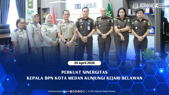 Senin [20/04/2026], Kepala Kejaksaan Negeri Belawan Dr. Yusup Darmaputra, S.H., M.H., didampingi oleh Kepala Seksi Perdata dan Tata Usaha Negara (DATUN), Bayu Esha Wirana, S.H., M.H., beserta Kasubsi Datun menerima kunjungan silaturahmi Kepala Kantor Pertanahan Kota Medan Rivaldi, S.SiT., M.M., beserta jajaran di Kantor Kejaksaan Negeri Belawan.