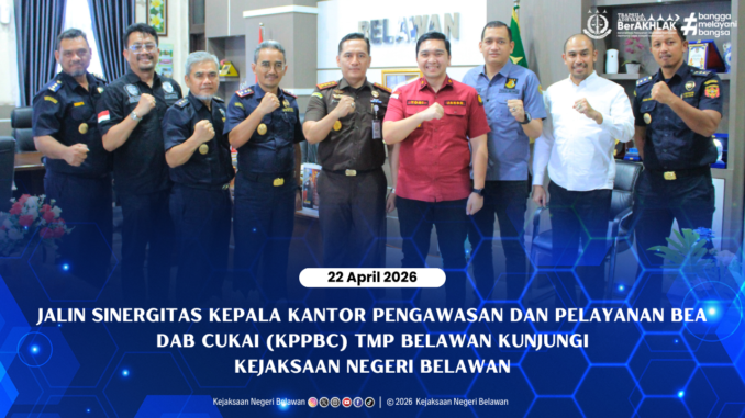 Rabu [22/04/2026], Kepala Kejaksaan Negeri Belawan Dr. Yusup Darmaputra, S.H., M.H., didampingi oleh para Kepala Seksi menerima kunjungan silaturahmi Kepala Kantor Pengawasan dan Pelayanan Bea dan Cukai (KPPBC) TMP Belawan, Agus Sujendro, S.E., M.M. beserta jajaran di ruang kerja Kepala Kejaksaan Negeri Belawan.
